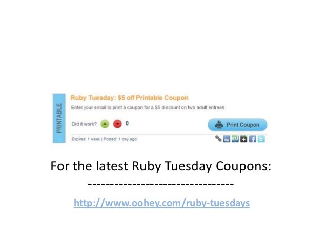 View Ruby Tuesday Coupon Code US. Best ruby tuesday coupon codes & deals. A trip to rubytuesday.com will let you see all that the menu has to offer along with the nutritional facts of each dish.
